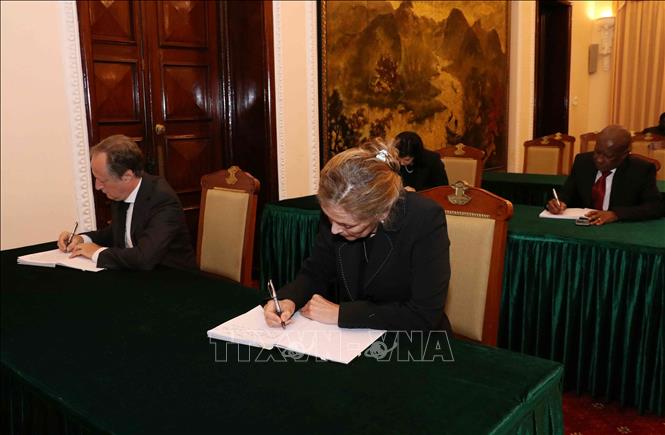 Các đại sứ, đại diện đại sứ quán các nước, đoàn ngoại giao, các tổ chức quốc tế tại Việt Nam ghi sổ tang nguyên Chủ tịch nước, Đại tướng Lê Đức Anh tại Nhà khách Chính phủ. Ảnh: Văn Điệp/TTXVN |