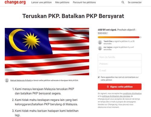 Gần nửa triệu người Malaysia đã ký tên kêu gọi chính quyền không nới lỏng lệnh kiểm soát đi lại tính đến tối 3/5. Ảnh chụp màn hình |