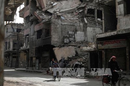 Cảnh đổ nát sau các cuộc giao tranh ở khu vực ngoại ô thủ đô Damascus. Ảnh: AFP |