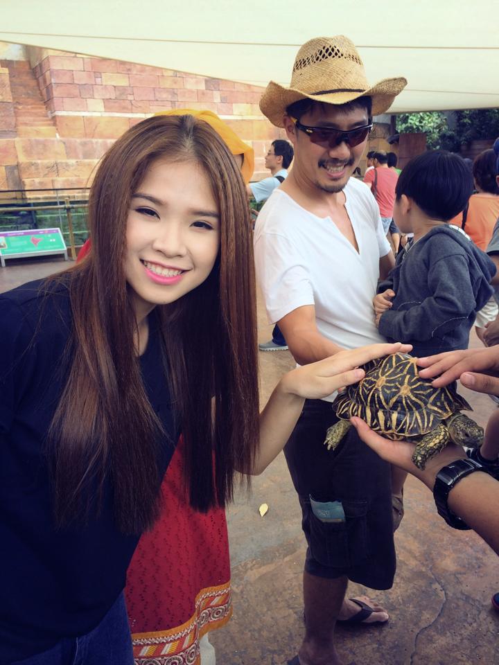 | Khởi My: "Mấy ngày nay xui xẻo quá, chạm vô con rùa vàng để lấy hên." |