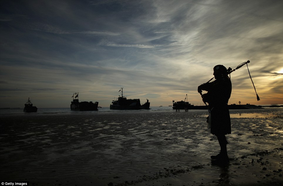 | Một người thồi kèn tại bãi biển Gold trong khi những con tàu của tập đoàn hàng hải hoàng gia (Anh) đến Arromanches Les Bains. |