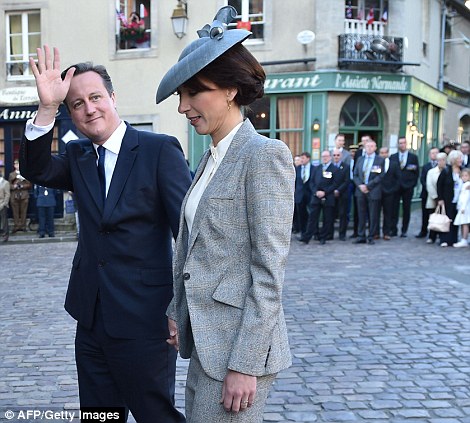 | Thủ tướng Anh David Cameron cùng phu nhân, Samantha, vẫy tay chào tại buổi lễ kỷ niệm cuộc đổ bộ tại thánh đường ở Bayeux sáng 6/6/2014. |