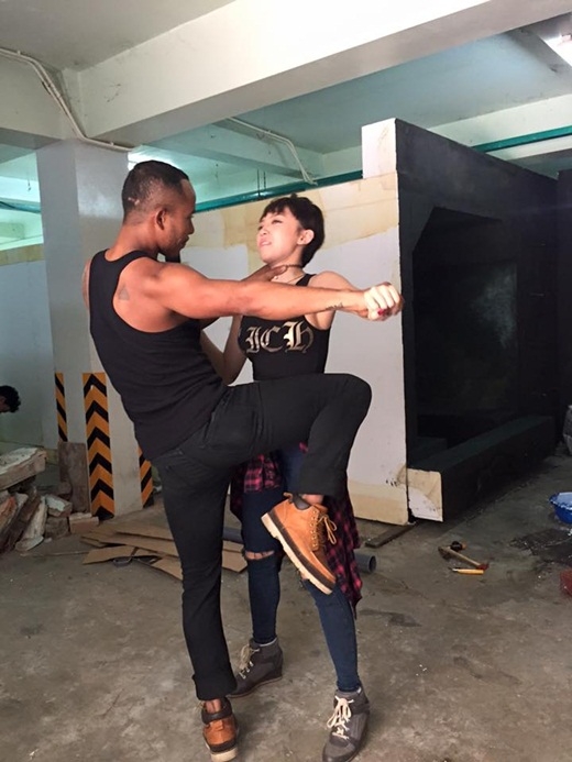 | Tóc Tiên bị David Phạm "hành hạ" trên phim trường. |