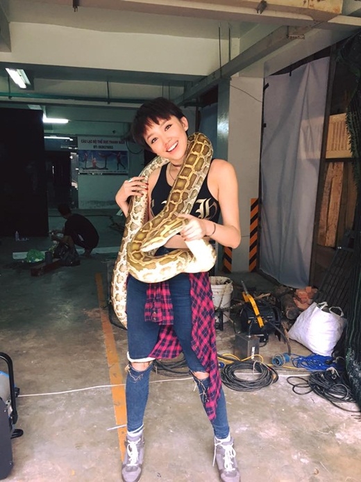 | Tóc Tiên khiến các fan hốt hoảng khi nhìn thấy hình ảnh cô nàng đang ôm một chú trăn khổng lồ. |