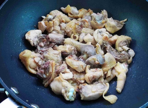 - Bước 1: Đun nóng chút dầu ăn trong chảo, cho thịt gà vào đảo đều cho thịt săn lại rồi trút ra bát.