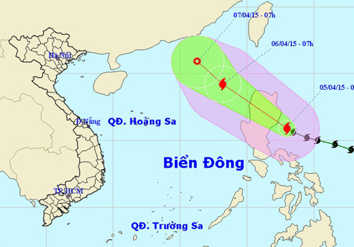 ![]() Hướng di chuyển của bão. Ảnh: Trung tâm DBKTTV TW (bản tin phát lúc 9 giờ ngày 5/4/2015). |