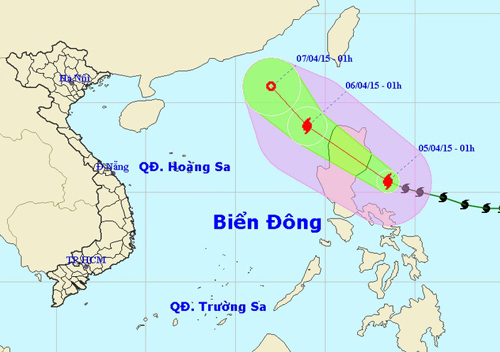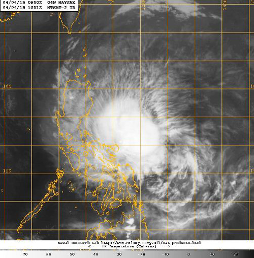 Bản tin lúc 9 giờ ngày 5/4/2015 của Trung tâm DBKTTV Trung ương cho hay hồi 8 giờ ngày 5/4 vị trí tâm bão Maysak ở vào khoảng 16,1 độ Vĩ Bắc; 122,8 độ Kinh Đông, trên vùng biển phía Đông đảo Lu Dông (Philippines).