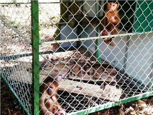Tiếp tục quan sát, chúng tôi phát hiện một khu đất, xung quanh được bao bọc bởi một con mương được đào cách đây chưa lâu với cái tên “đảo khỉ”. Thời điểm chúng tôi có mặt, tại “đảo Khỉ” có 4 cá thể khỉ đang bị nhốt trong lồng nuôi.