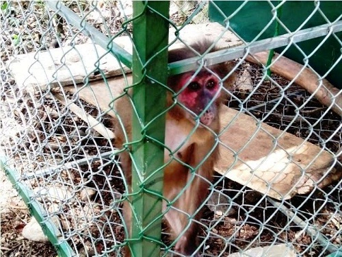 Tiến lại gần, chúng tôi tận mắt nhìn thấy những chú khỉ đều đang bị xiềng xích, ngồi thụt lại trong góc chuồng. Trên khuôn mặt đỏ tía hiếm thấy của một cá thể khỉ (nghi là khỉ mặt đỏ), cặp mắt hiện rõ nét buồn rười rượi, nhìn chúng tôi như cầu xin sự cứu cánh, trông đến tội nghiệp.