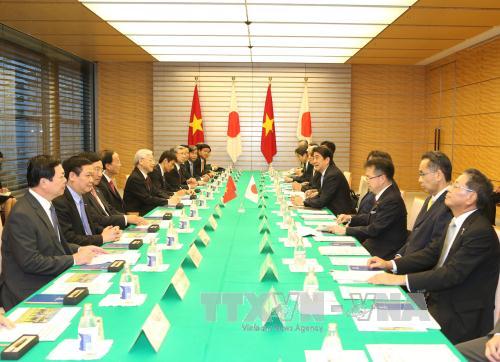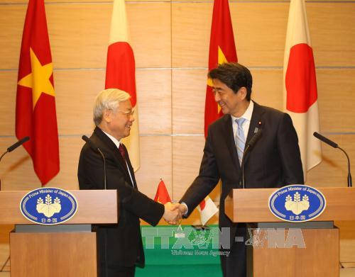 Thủ tướng Shinzo Abe nhiệt liệt chào mừng Tổng Bí thư Nguyễn Phú Trọng thăm chính thức Nhật Bản, cho rằng chuyến thăm Nhật Bản lần này của Tổng Bí thư sẽ mở ra cơ hội mới góp phần thúc đẩy quan hệ Việt Nam – Nhật Bản phát triển ngày càng toàn diện và sâu sắc hơn. Theo đặc phái viên TTXVN, Thủ tướng Shinzo Abe nhấn mạnh Nhật Bản hết sức coi trọng và ưu tiên cao cho quan hệ với Việt Nam, mong muốn tăng cường hơn nữa quan hệ Đối tác chiến lược sâu rộng giữa hai nước.