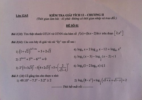 Tháng 11/2013, xuất hiện đề toán Giải tích (lớp 12A5 của một trường THPT) với thời gian làm bài 43 phút. Đề toán này gây chú ý bởi những câu dẫn dắt vào đề hài hước và khác biệt. Thông thường bài kiểm tra sẽ là 45 phút, tuy nhiên đề bài lại cho 43 phút kèm theo dòng chữ "không kể thời gian nháp và trao đổi".
