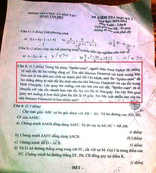 Đề thi học kỳ 2 môn Toán của trường THCS Tân Phú, TP. HCM cũng khiến nhiều người "choáng" trước những dữ liệu của bộ phim "Spider man" và chiều cao của tòa nhà Bitexco.