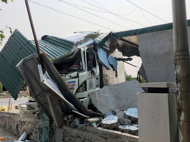 Chiếc xe tải tông sập tiệm cắt tóc. Ảnh: Người Đưa Tin |