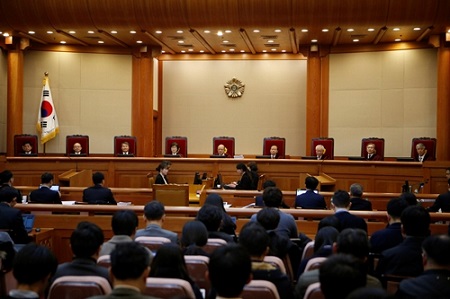 9 thẩm phán Tòa án Hiến pháp Hàn Quốc trong phiên tranh luận về quyết định luận tội Tổng thống Park Geun-hye ngày 5/1. Ảnh: Reuters. |