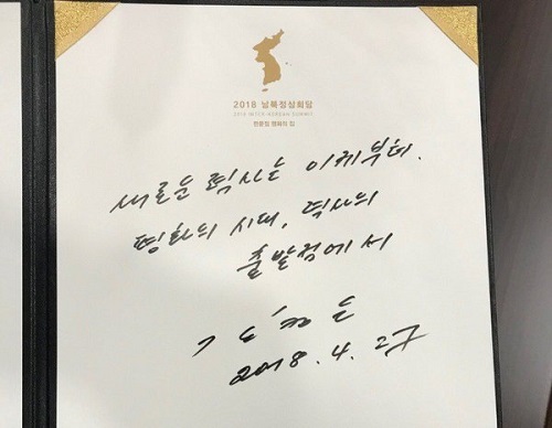 "Một trang sử mới bắt đầu ngay bây giờ, ở điểm khởi đầu của lịch sử và kỷ nguyên hòa bình", lãnh đạo Triều Tiên Kim Jong-un viết trong sổ lưu niệm tại Nhà Hòa bình. - Ảnh: Twitter. |