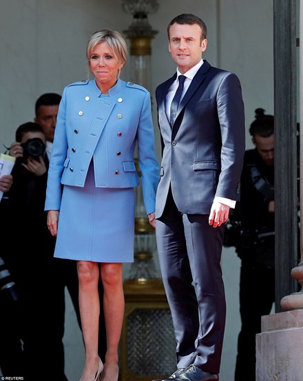 Theo VnExpress, ông Macron tới điện Elysee trong lúc trời mưa nhẹ. Ông mặc bộ vest tối màu của thương hiệu Pháp Jonas & Cie trị giá 450 euro (hơn 490 USD). Ông Hollande đứng chờ và đón người kế nhiệm tại cửa điện. Bà Brigitte, vợ ông Macron, mặc đồ màu xanh da trời nhạt, do nhà thiết kế người Pháp Nicolas Ghesquiere thiết kế cho hãng Louis Vuitton, và đi riêng.