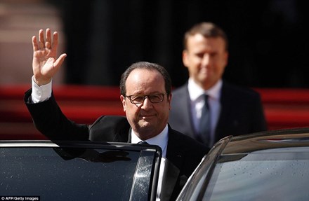 | Cựu Tổng thống Hollande vẫy chào người tiền nhiệm trước khi lên xe rời khỏi nơi ông đã gắn bó suốt 5 năm qua. Ảnh: AFP |