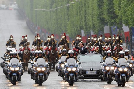 | Ông Hollande vẫy chào người dân Pháp dưới trời mưa tầm tã. Ảnh: BBC |
