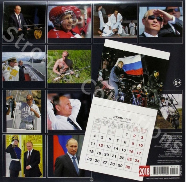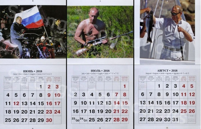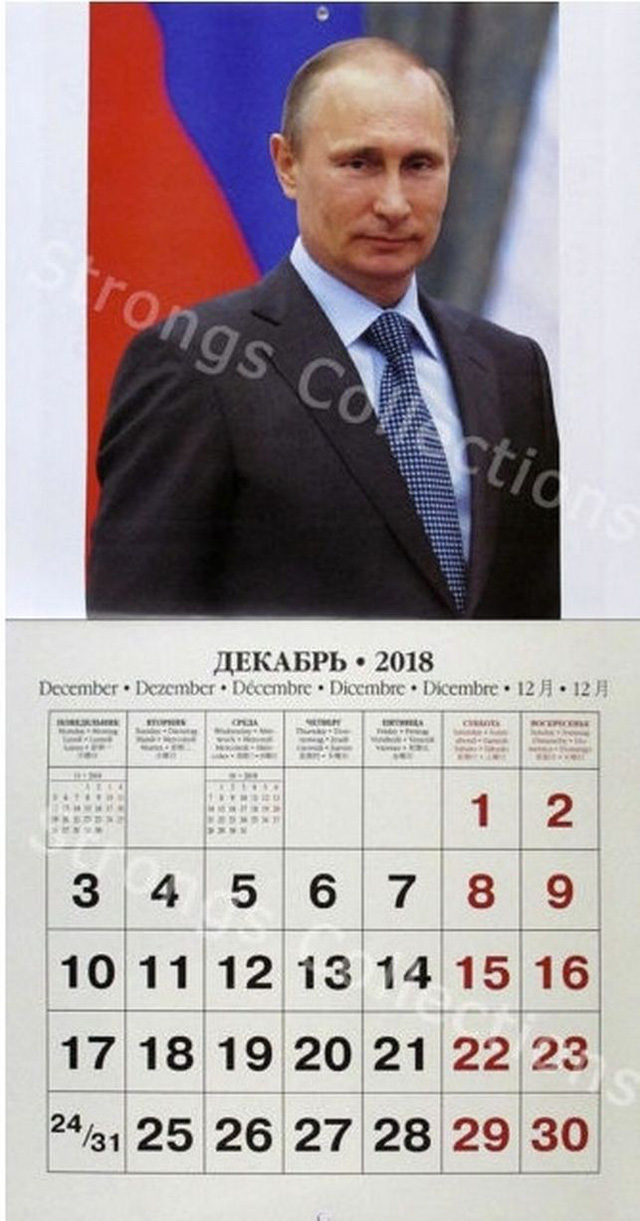 Trong tờ lịch in những tháng cuối năm 2017, Tổng thống Putin được nhìn thấy ôm một con mèo. Tiếp đó, tờ lịch tháng 1 và tháng 2 in hình ảnh nhà lãnh đạo Nga phát biểu tại Liên Hợp Quốc và chơi khúc côn cầu trên băng. |