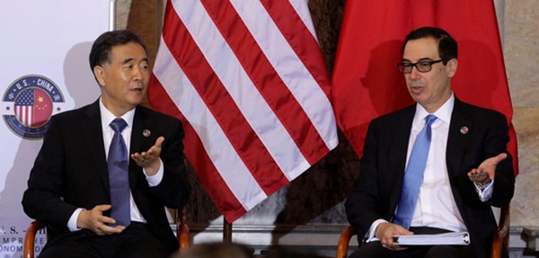 Bộ trưởng Tài chính Mỹ Steve Mnuchin và Phó thủ tướng Trung Quốc Uông Dương trước buổi Đối thoại Kinh tế Toàn diện Mỹ - Trung hôm 19/7 ở Mỹ. (Ảnh: Reuters) |