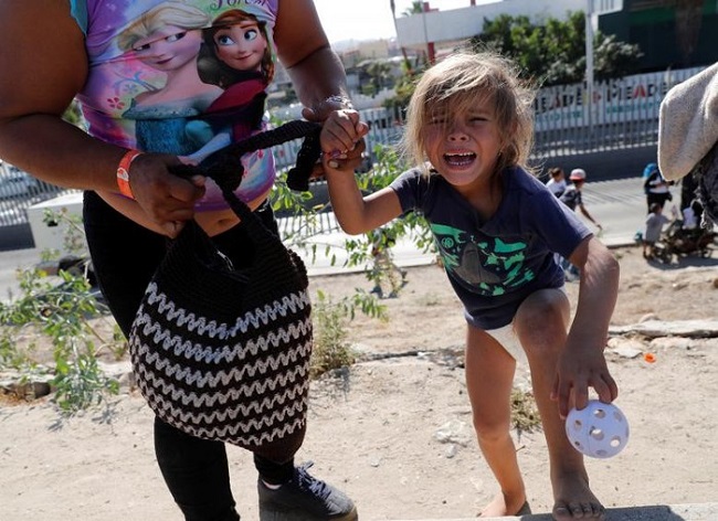 Một bé gái đến từ Honduras bật khóc gần bức tường biên giới ở Tijuana, Mexico, ngày 25/11. Ảnh: AP |