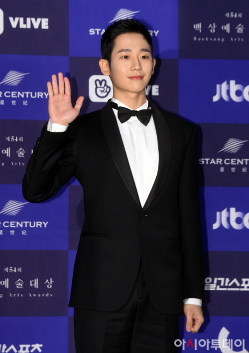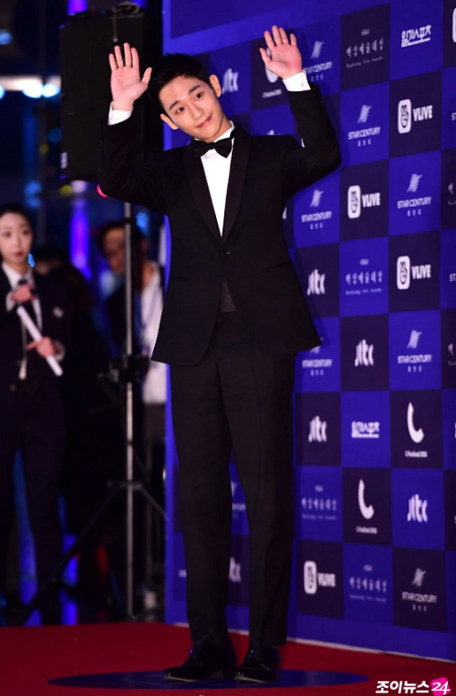 Nam diễn viên đang “gây bão” Jung Hae In cũng xuất hiện trong bộ tuxedo đen đơn giản. Với vóc người cao ráo, body đẹp chuẩn dù mặc trang phục tối giản nhưng anh chàng vẫn đẹp nổi bật và thu hút ánh nhìn của mọi người.