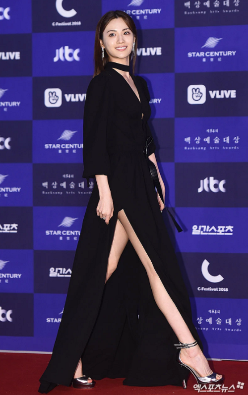 After School 's Nana đi trên thảm đỏ trong chiếc váy màu đen quyến rũ được cắt xẻ khéo léo để khoe trọn đôi chân dài của cô với mỗi bước đi. Với cổ chữ V sâu ở phía trước và đường cắt dài bên cạnh chiếc váy, người hâm mộ hoàn toàn “đổ gục” trước vẻ đẹp sexy của người đẹp.