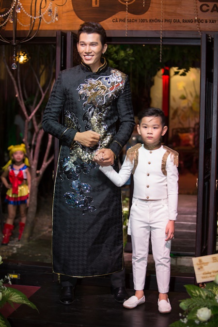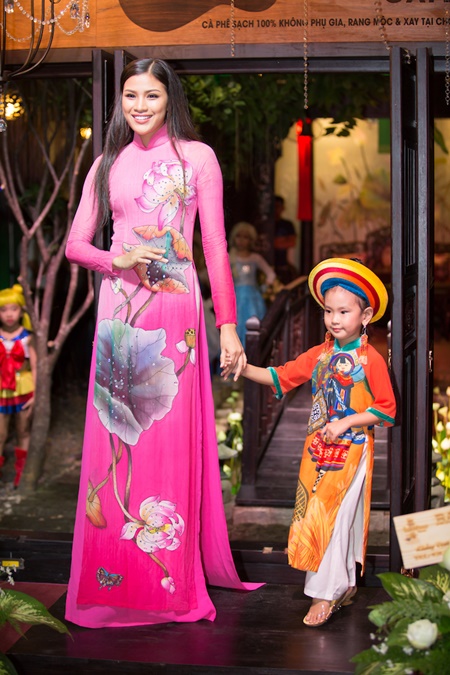 Các mẫu nhí diện các thiết kế có cảm hứng cung đình, phù hợp với không gian xưa trầm mặc của quán, riêng top 3 Hoa khôi du lịch đặc biệt diện 3 thiết kế áo dài có hoạ tiết hoa sen rực rỡ, đài các.