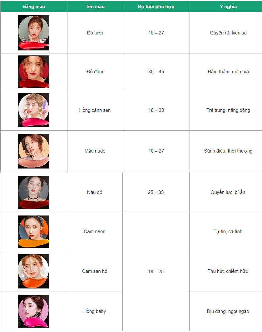 Khi phun xăm, đặc biệt là phun xăm môi, để màu lên đẹp, hợp với màu da cũng như tính cách. Tổng hợp bảng màu phun môi đẹp, được nhiều Eva thực hiện nhất được tổng hợp trong bảng sau: