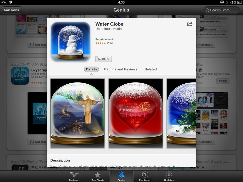 "Water Globe" đơn giản chỉ là một tập hợp các trò chơi màn hình tương tác. Trò chơi đơn giản với quả cầu, bạn có thể tạo tuyết hay thay đổi trực tâm quả cầu. Thật khó hiểu tại sao họ lại bỏ ra 300$ cho ứng dụng này, trong khi bạn hoàn toàn có thể sở hữu một quả cầu tuyết thật với cái giá rẻ hơn nhiều.
