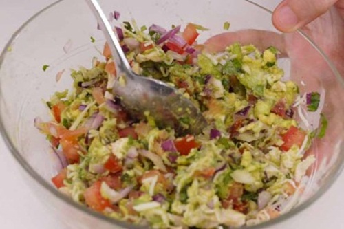 Trộn bơ, ức gà, cà chua, hành tây, rau mùi, phô mai, nước chanh, muối và hạt tiêu lẫn với nhau để làm nhân.