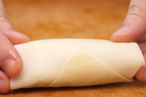Cho nhân vào giữa lá bánh tortilla rồi cuộn lại như gói nem