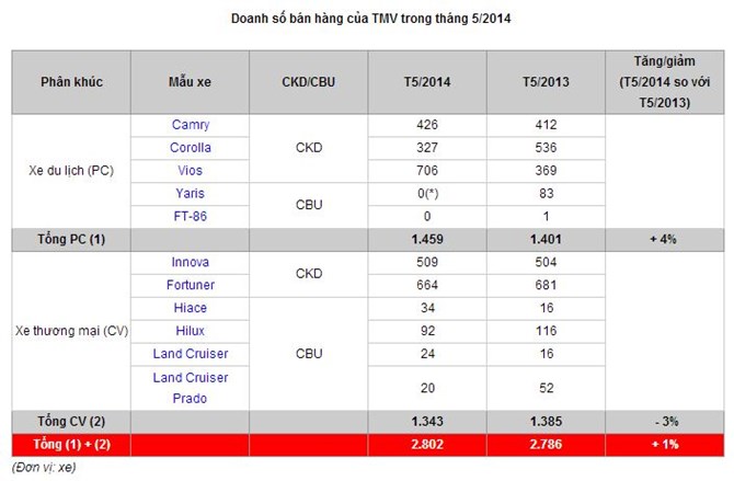Báo cáo từ bộ phận kinh doanh Công ty ô tô Toyota Việt Nam (TMV) cho biết, trong 5 tháng đầu năm 2014, doanh số bán hàng các mẫu xe Toyota đạt 13.230 xe, tăng 10\% (tương đương khoảng 1.195 xe) so với cùng kỳ năm 2013.