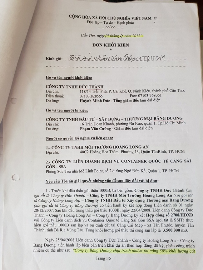 Hồ sơ khởi kiện được nộp tại Tòa án nhân dân Quận 1 (TP. HCM). Nhưng sau khi tìm hiểu, công ty Đức Thành nhận thấy việc nộp Hồ sơ khởi kiện tại Tòa án nhân dân Quận 1 là không hợp lý. Cụ thể, theo quy định: Tại thời điểm khởi kiện, thời điểm thụ lý vụ án, luật áp dụng: Bộ Luật tố tụng dân sự năm 2004 quy định tại điều 29, được hướng dẫn tại nghị quyết số 03/2012/NQ-HĐTP ngày 03/12/2012 của Hội đồng thẩm phán Tòa án nhân dân Tối cao, tại Điều 2 khoản 1 điểm b) Tòa kinh tế có nhiệm vụ, quyền hạn giải quyết các tranh chấp và các yêu cầu về kinh doanh, thương mại quy định tại Điều 29 và Điều 30 của BLTTDS; tranh chấp về kinh doanh, thương mại mà một hoặc các bên không có đăng ký kinh doanh, nhưng đều có mục đích lợi nhuận: Xác định Tòa kinh tế có nhiệm vụ, quyền hạn giải quyết các tranh chấp và các yêu cầu về kinh doanh, thương mại. Như vậy, theo công ty Đức Thành, hồ sơ khởi kiện của đơn vị này phải thuộc thẩm quyền giải quyết của Tòa Kinh Tế Tòa án nhân dân TP. HCM.