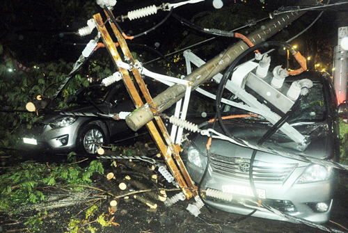 Cây xanh trong công viên đổ kéo theo trụ điện ngã xuống đè trúng nhiều ôtô. Ảnh: A.X |