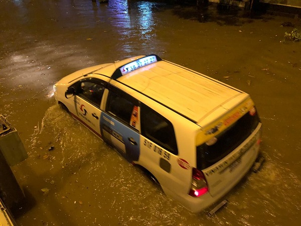Một chiếc xe ba gác bị bỏ lại vì nước ngập dâng cao trên đường Nguyễn Hữu Cảnh. |