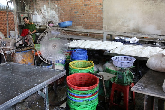 Ngày 9/1, Cục Cảnh sát phòng chống tội phạm về môi trường (Bộ Công an) phối hợp Đội Quản lý thị trường số 28 (Cục Quản lý thị trường TP.HCM), kiểm tra đột xuất hai cơ sở sản xuất bún tươi tại quận Bình Tân.
