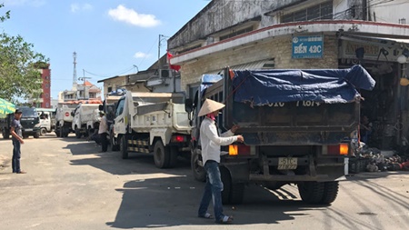 Xe tải xếp hàng chờ vào chở cát tại một vựa trên địa bàn Q.4, TP. Hồ Chí Minh. Ảnh: Thanh Niên. |