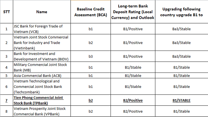 Moody’s cho biết chỉ có một vài ngân hàng được tăng mức xếp hạng trong đợt này gồm Vietcombank, Vietinbank, BIDV, TPBank... Cũng theo kết quả xếp hạng này, TPBank hiện đang có mức xếp hạng tín nhiệm ngay sau mức của Việt Nam (Ba3) và hiện đang có cùng xếp hạng với một vài ngân hàng TMCP lớn như: Ngân hàng Quân đội (MB), Ngân hàng Kỹ Thương Việt Nam (Techcombank), Ngân hàng TMCP Á Châu (ACB), Ngân hàng Việt Nam Thịnh Vượng (VPBank)…