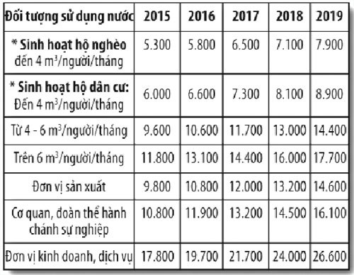 Các mức giá nước được xây dựng theo đối tượng sử dụng nước trong lộ trình 2015 - 2019 |