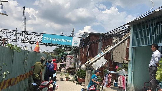 Hôm 22/7, chiếc cần cẩu thi công công trình tại TP.HCM bất ngờ lật nghiêng kéo gãy trụ điện, đè lên mái nhà dân.
