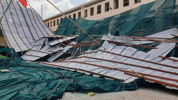 Trận giông lốc nghiêm trọng đã khiến mái tôn của hầu hết các lớp học tại trường THPT Bình Phú (quận 6, TP.HCM) bị hất bay, nằm ngổn ngang dưới sân trường.
