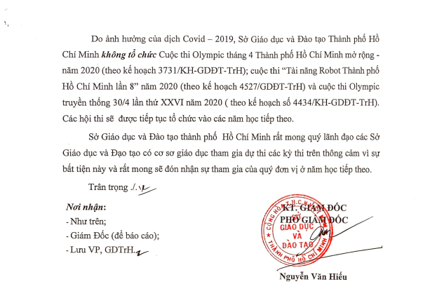Theo đó, do ảnh hưởng của dịch Covid-19, sở GD&ĐT TP.HCM không tổ chức cuộc thi Olympic tháng 4 TP.HCM mở rộng, Tài năng Robot TP.HCM lần 8 và Olympic truyền thống 30/4 lần 26 trong năm 2020. Các cuộc thi này sẽ được tổ chức vào năm tiếp theo.