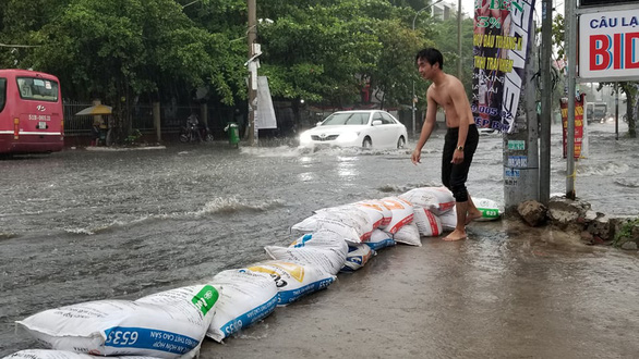 Người dân lấy bao cát chắn nước trên đường Hiệp Bình, quận Thủ Đức |