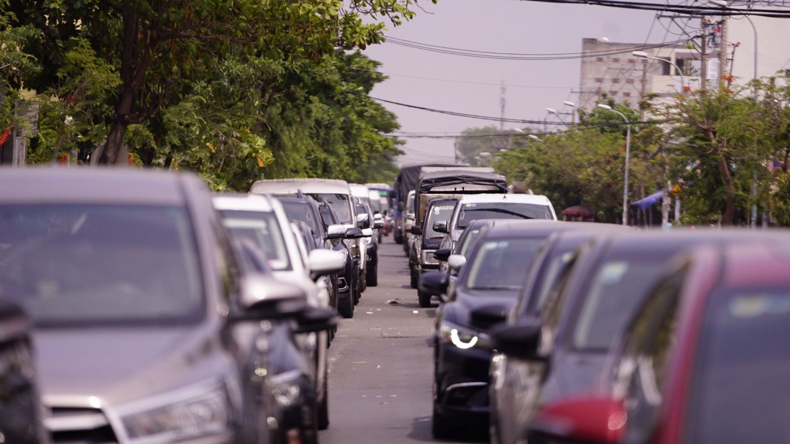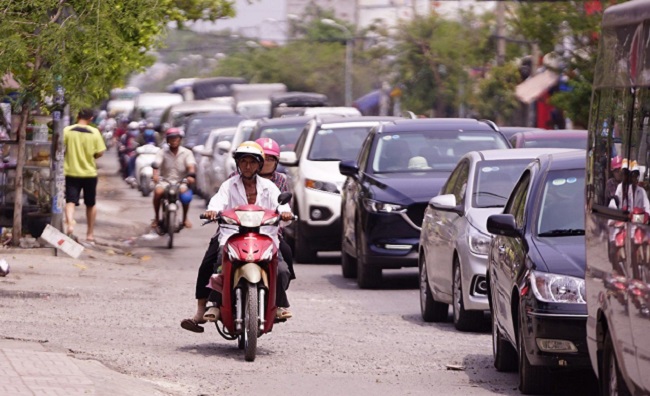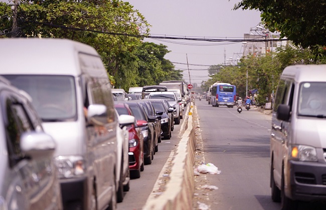 Lượng người đi chơi lễ qua phà Bình Khánh tăng cao khiến các phương tiện bị ùn ứ phía bên đường Huỳnh Tấn Phát (huyện Nhà Bè). |