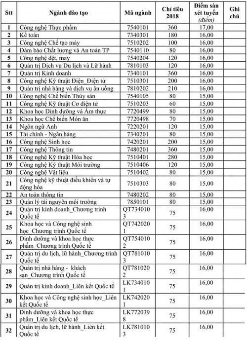 Ngày 6/7, Trường Đại học Công nghiệp Thực phẩm TP.HCM công bố điểm sàn xét tuyển và chỉ tiêu vào trường năm học 2018- 2019. Theo đó, điểm sàn xét tuyển các ngành dao động từ 15 đến 17 điểm. Những thí sinh trên mức điểm này trường mới nhận hồ sơ, do đó, điểm chuẩn chính thức có thể bằng hoặc cao hơn ngưỡng điểm sàn xét tuyển này.