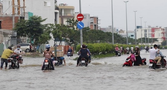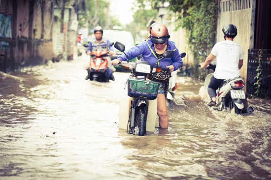 Triều cường dâng cao khiến các phương tiện di chuyển khó khăn. |