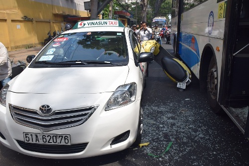 Cú va chạm mạnh làm phần đầu của xe máy nằm lên trên chiếc taxi, riêng xe bus thì bị hư hỏng phần cửa kính trước.