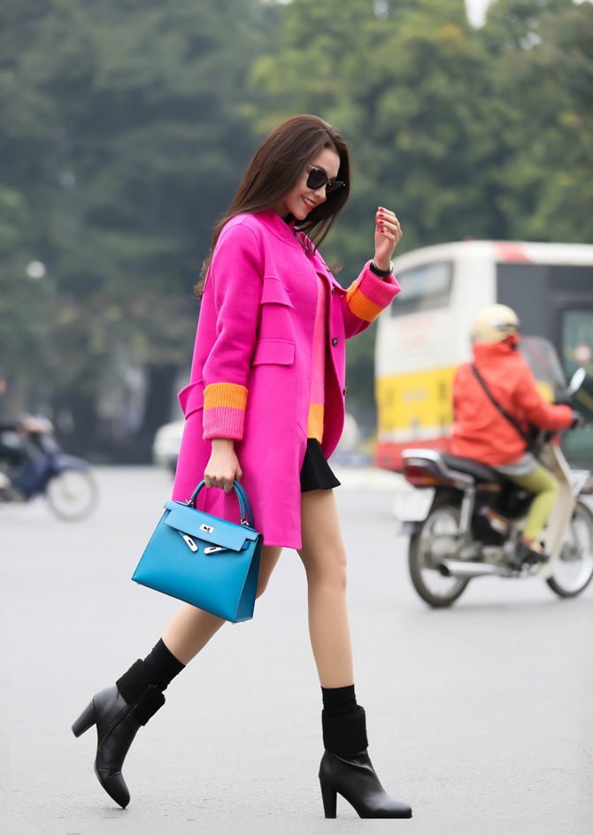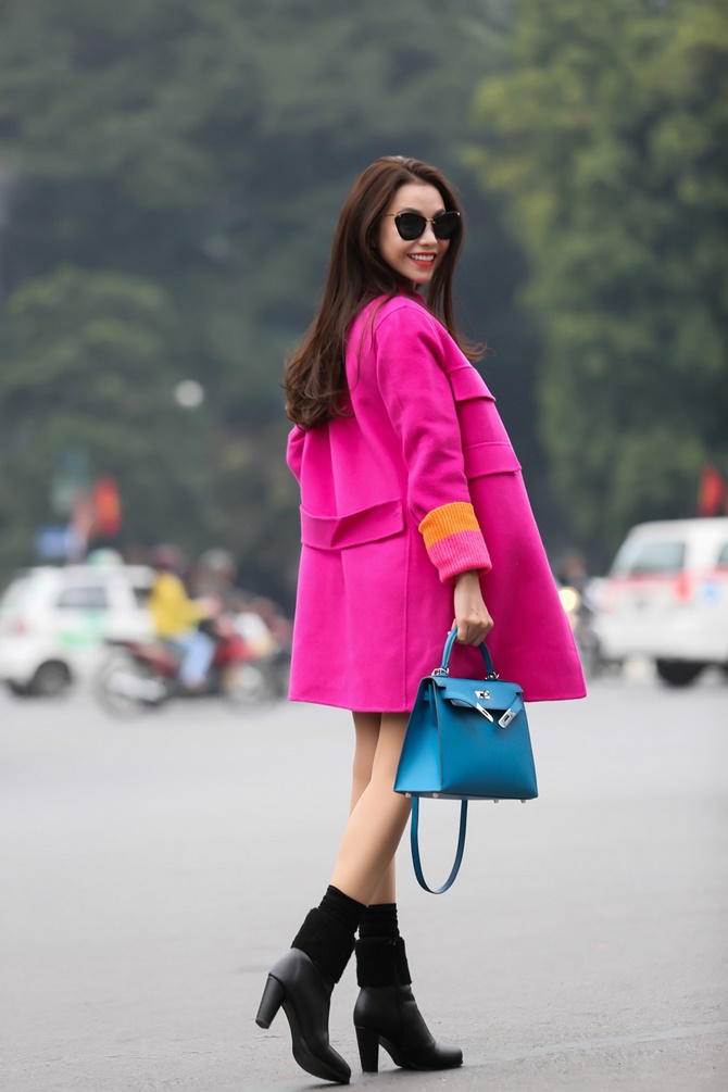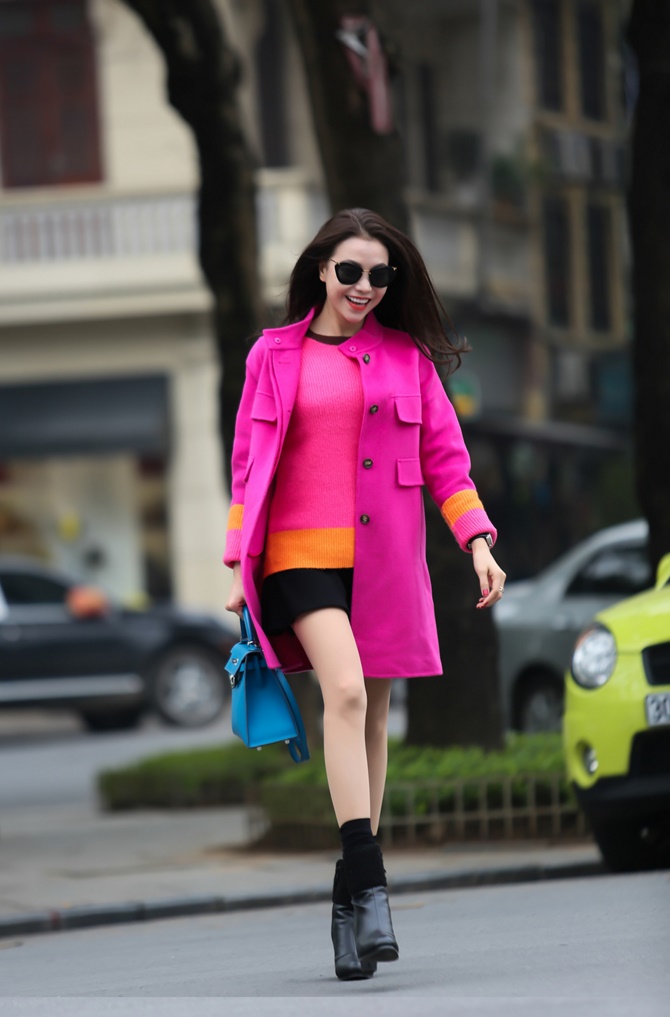 Trong cách mặc của Trà Ngọc Hằng, cô biết sử dụng tối đa lợi thế cặp chân dài và thẳng nên dùng tất da chân dày ấm để vẫn có thể giữ được ấm và vẫn khoe được cặp chân thẳng tắp, gợi cảm.
