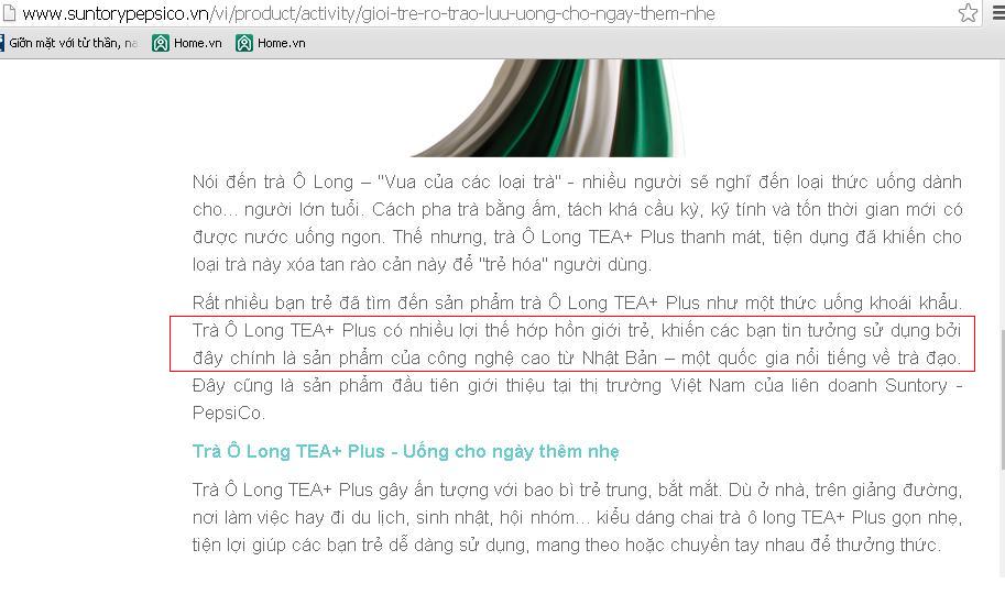 Cụ thể, trên trang web của Suntory Pepsico Việt Nam tiếp tục cho quảng cáo rầm rộ việc trà ô long TEA+ Plus được sản xuất trên "dây chuyền hiện đại Nhật Bản" bằng những mỹ từ như: